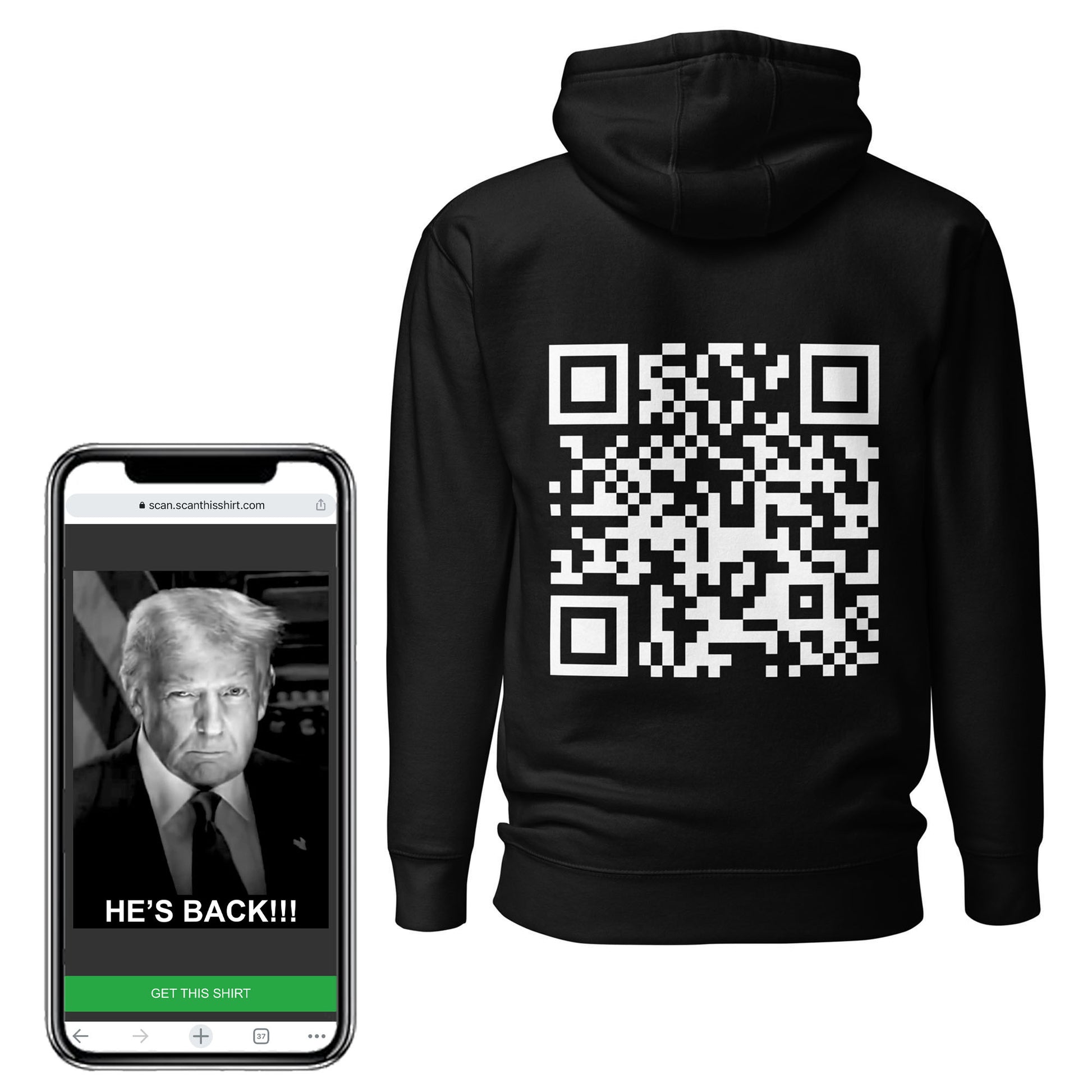 Troll an unsuspecting victim with this preset QR HE'S BACK T-shirt. When they scan your QR code, the HE'S BACK with Trump's photo will pop up on their phone.